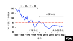 在日本、台湾、韩国商品的冲击下,美国出口/进口跌至1985年的65%,于是爆发了美日贸易战,并在1985年签署了广场协议(Plaza Accord),弱化美元,使得美国的出口/进口从1986年的62%回升到1991年的86%。