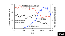 中国商品在1980年代开始流入美国。尤其是2001年中国加入世贸组织后,大量廉价中国商品冲击了美国的制造业,使得美国的出口/进口降至2005年的54%。