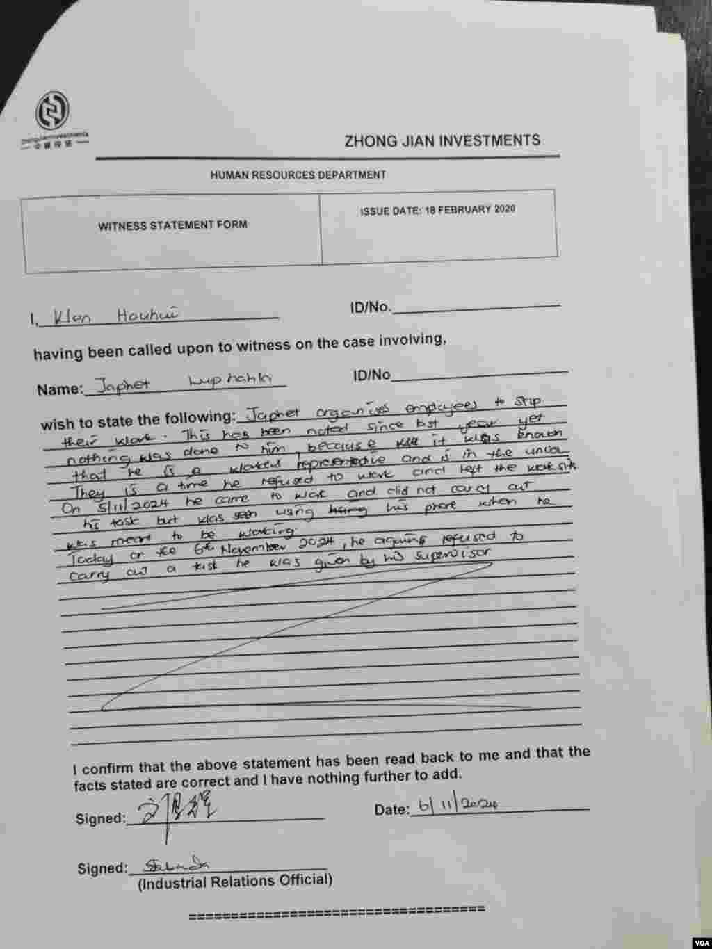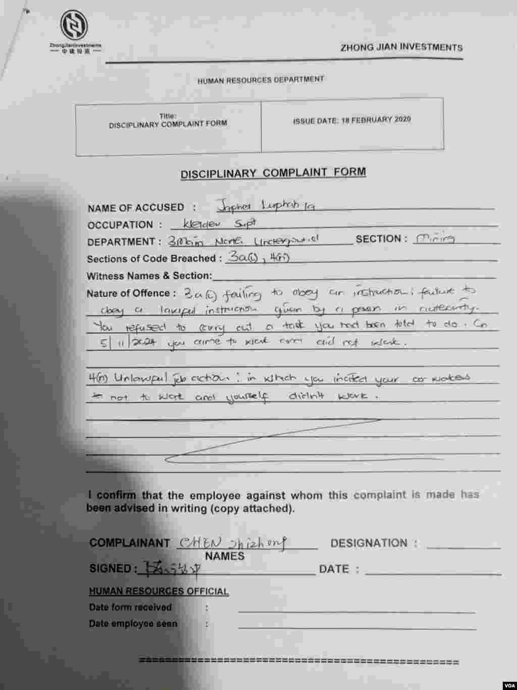 中建矿工委员会的前主席贾费特·鲁帕赫拉(Japhet Lupahla)接到的裁员通知书(2024年11月15日) (美国之音/伊诺斯·丹赫尔)