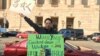 庄烈宏在接受美国之音采访时说,去年6月到9月乌坎村民游行抗议时被非法抓捕,被关进监狱后甚至被限制上诉的权利。一幅展开的横幅上印着9名被抓乌坎村民的照片和名字。